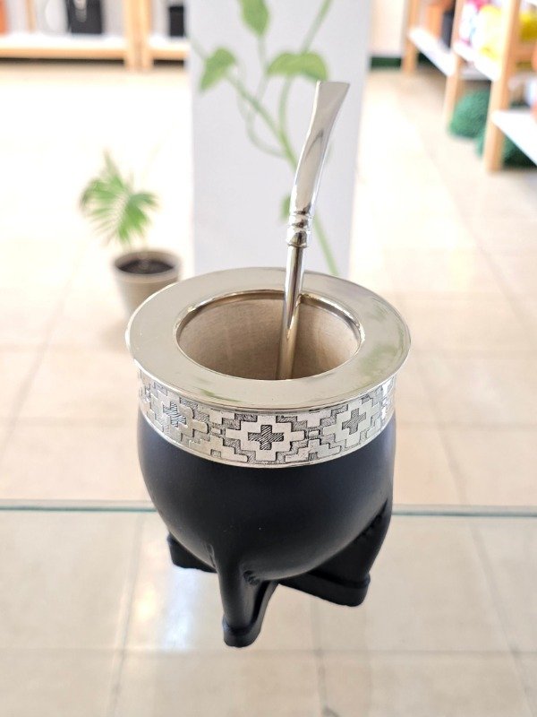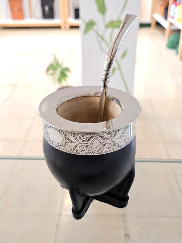 Mate Imperial de Calabaza, con Virola y Guarda en Alpaca, Forrado en Cuero Negro
