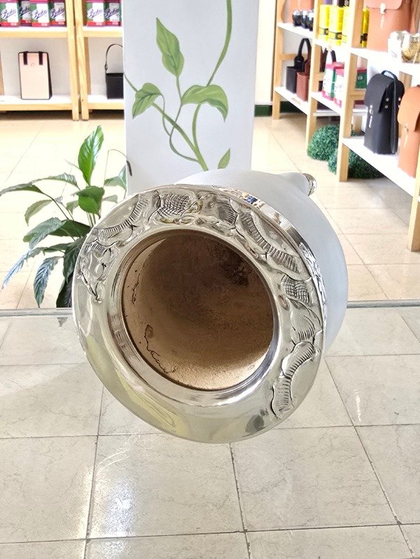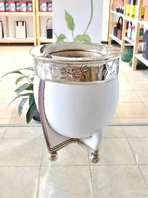 Mate Imperial Alpaca Cincelada con Base Bolitas Forrados en Cuero Blanco