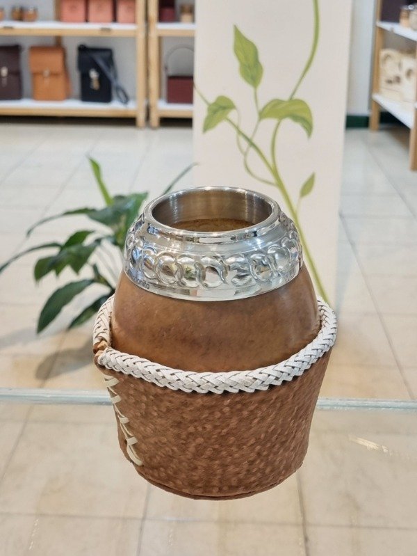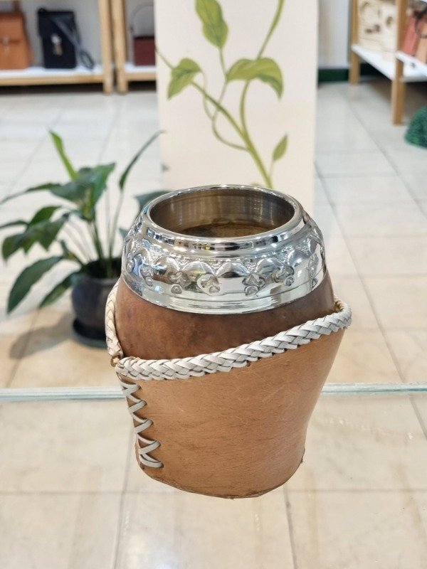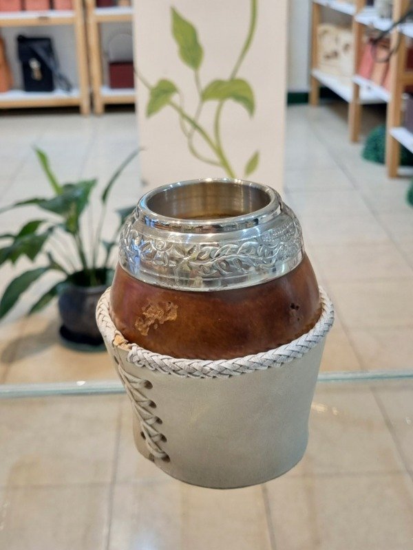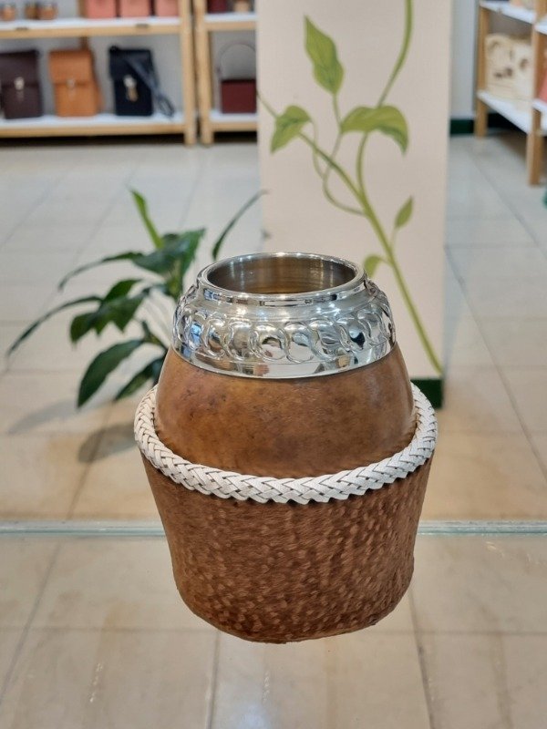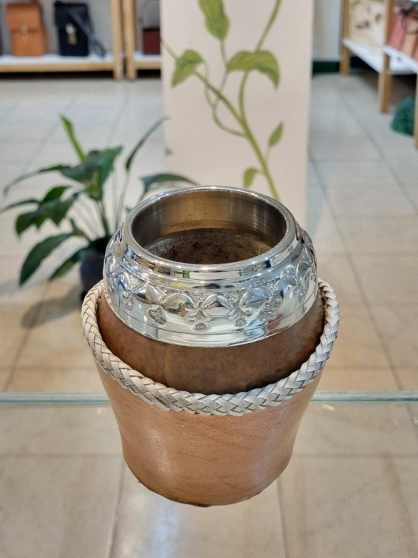 Mate Torpedo Criollo Calabaza Pulida, Alpaca Cincelada, Base Cuero Trenzado