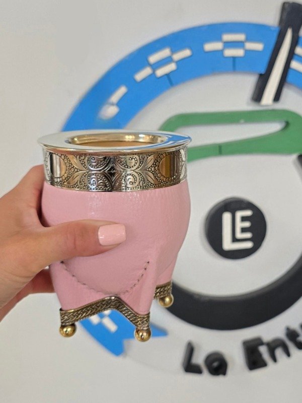 Mate Imperial Alpaca con Bolitas en Bronce, Forrado en Cuero Rosa