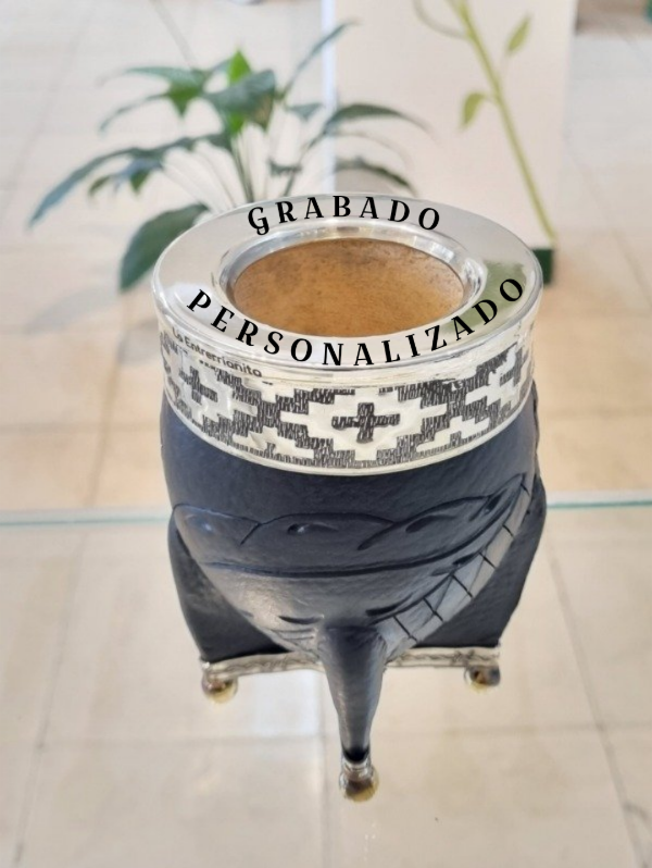 Mate imperial de calabaza, forrada en cuero repujado, virola en alpaca, refuerzo en patas y bolitas en bronce